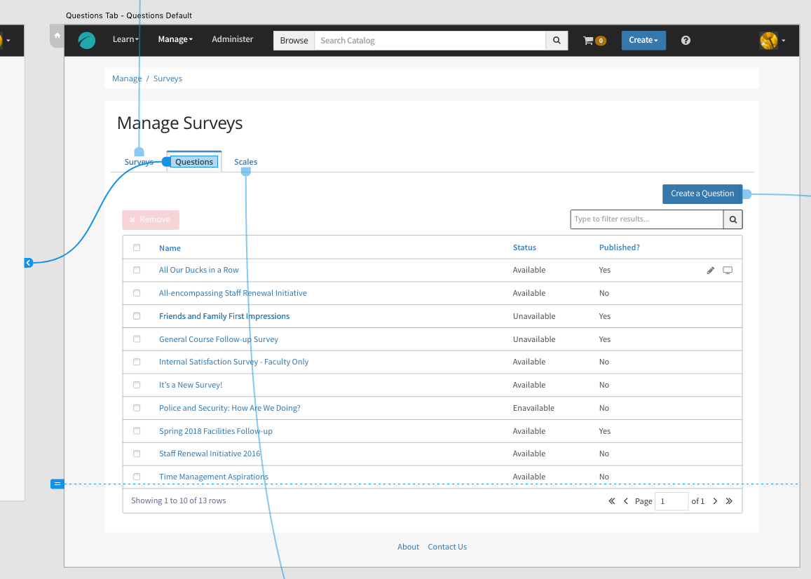 A sustained round of discovery with our customers revealed some important information about this legacy survey system. The process of creating and managing surveys had become cumbersome and confusing. Required components for creating surveys were isolated from one another—sometimes housed in completely separate applications.
